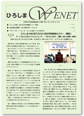 広報紙「ひろしまWENET」61号を発行しました お知らせ 2026.04.05 ●ひろしまWENET 2026男女共同参画セミナー(報告) ●広島市議会傍聴記、2026国際女性デーひろしま ●フラワーデモ in ひろしま、ひろしまWENETからのお知らせ 下の画像をクリックしてPDFをご覧ください。